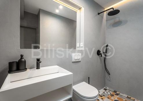 Bathroom: toilet, sink, shower, ventilation, direct and indirect lighting