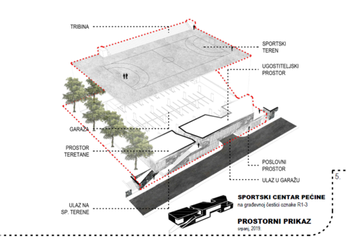 Für das Gelände wurde ein Konzeptentwurf erstellt, der den Bau des SPORTZENTRUMS PEĆINE mit Tiefgarage, Hauptgebäude und Sportplatz in Rijeka, Siedlung Pećine vorsieht. Das betreffende Gebiet liegt im Geltungsbereich der DPU des Stadtgebiets Pećine und hat die Planungsbezeichnung R1-3. Laut DPU umfasst die Zone den geplanten Zweck R1 – Sport- und Freizeitzweck – SPORT. Laut DPU hat das Baugrundstück mit der Planungsbezeichnung eine Gesamtfläche von 3.072,0 m², wobei die maximal zulässige bebaute Fläche des Grundstücks 2.445,0 m² beträgt. Die maximal zulässige Anzahl an Stockwerken beträgt P+1 bei einer maximalen Gebäudehöhe von 8,0 m. AKTUELLE SITUATION Bei der betroffenen Zone handelt es sich im Wesentlichen um ein flaches Plateau etwa 1,5 m über der Straße, auf dem ein Sportplatz, nämlich zwei Tennisplätze, angelegt wurde. Zum Gelände gehört neben dem gepflegten Sportplatz auch eine Sport- und Gastronomieanlage. Auf der Südwestseite wird das Grundstück durch eine Straße begrenzt, die etwa 1,5 m unter dem Niveau des Sportplatzplateaus liegt. Die nordwestliche und ein Teil der südöstlichen Seite werden durch einen öffentlichen Fußgängerbereich – öffentliche Treppen – definiert. Es wird auf der nordöstlichen Seite und teilweise auf der südöstlichen Seite von einer Klippe begrenzt. GEPLANTER ZUSTAND: Dieser Konzeptentwurf sieht den Bau des Sportzentrums Pećine und einer Tiefgarage für insgesamt 59 Parkplätze vor. Auf dem Dach der Garage ist die Einrichtung eines Sportbereichs und eines Teils der Tribünen geplant. Gemäß der kartografischen Darstellung 4.BAUBEDINGUNGEN ist auf einem Baugrundstück mit der Planungsbezeichnung R1-3 die Errichtung eines Erdgeschosses + 1 Gebäudes auf der Regulierungslinie mit einer Gesamtgrundfläche von 490,0 m² und einer Gesamtbruttofläche von 780,0 m² geplant. Im geplanten Gebäudeteil sollen Sport- und Freizeiteinrichtungen wie ein Vereinsbereich, Umkleidekabinen, ein Fitnessstudio sowie Gastronomie- und Geschäftsräume untergebracht werden. Zur Erweiterung des Baugrundstücks ist eine Tiefgarage mit Einfahrt von der Šetalište-Straße, XIII. Abteilung, geplant. Auf dem Dach der Garage entsteht ein Sportplatz mit Tribünenaufstellung. Liste der Nettoflächen: 1 - TECHNIKRAUM 44,0 m² 2 - TURNHALLE 1 150,0 m² 3 - KOMMUNIKATION 21,5 m² 4 - SPORTCLUB 28,0 m² 5 - TECHNIKRAUM 12,0 m² 6 - BÜROFLÄCHEN 113,5 m² 7 - TIEFGARAGE 1.800,0 m² 8 - TURNHALLE 2 109,0 m² 9 - DURCHGANG UND TREPPE 67,5 m²x0,5 10 - GARDEROBE 16,5 m² 11 - KOMMUNIKATION 21,5 m² 12 - SANITÄRRÄUME 19,0 m² 13 - ATRIUM 113,5 m²x0,5 CATERINGFLÄCHE 170,0 m² 15- TERRASSE 26,0 m²x0,5 16- SPORTPLATZ 17- TRIBÜNEN GESAMT 2.608,5 m2 - Bauland für ernsthafte Investoren - eine Rarität auf dem Markt - Grundstück an der Stadtgrenze - Zugang ist von der Hauptstraße gewährleistet und befindet sich in unmittelbarer Nähe (fußläufig erreichbar) einer Grundschule, eines Kindergartens und anderer Annehmlichkeiten des täglichen Lebens. Ein Anwesen, von dem aus Sie in nur einer Minute zu Fuß zum Meer und Strand gelangen! PEĆINE: Zahlreiche Villen mit grünen Innenhöfen, wunderschön angelegte Parks, eine Reihe von Stränden und Badebereichen sowie eine interessante Geschichte sind die Merkmale, die dieses Viertel von Rijeka im äußersten Südosten der Stadt schmücken. Der ehemalige Wohnort der Reichen ist mit Sommerhäusern entlang der Küste geschmückt, die von üppigen Blumengärten umgeben sind, während in einer späteren Periode Wohnhäuser errichtet wurden. Rijekas erstes großes Einkaufszentrum, ein Vergnügungspark für Kinder, ein Handball- und Tennisclub, Sportvereine, die Lage, die Nähe zum Stadtzentrum, ein Hotel und drei Hostels sind nur einige der Merkmale dieses Viertels, das Leben mit Entspannung und Erholung bietet.