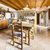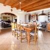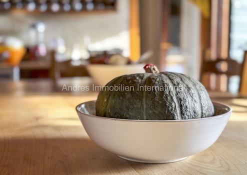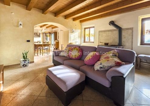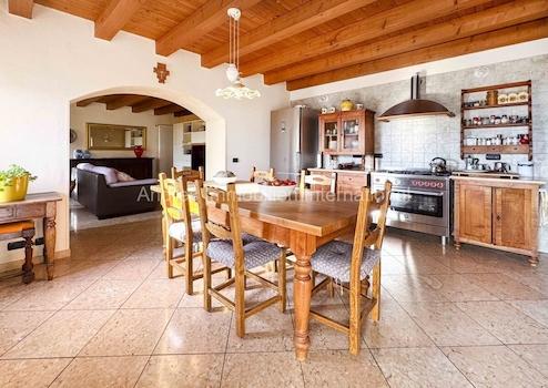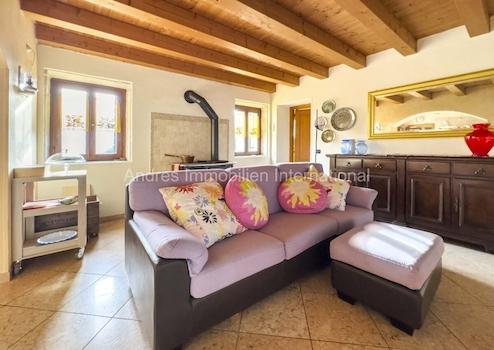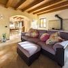Hier finden wir ein großes Wohnzimmer und eine Küche im rustikalen Stil, die sich durch authentische Details wie das große Steinwaschbecken auszeichnet.
