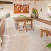 Küche mit Marmorplatte, freiliegenden Wänden und Lessinia-Steinboden. Die Küche wurde in dem Raum eingerichtet, in dem sich einst der Stall befand