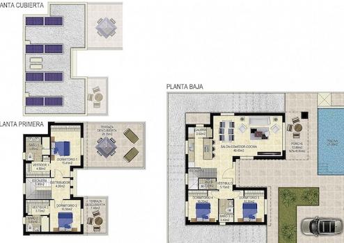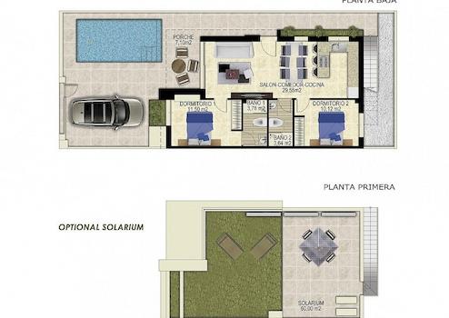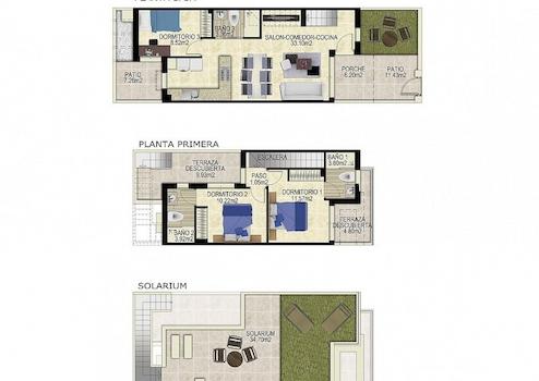 Casa Oranger sind Duplex-Immobilien mit 3 Schlafzimmern, 3 Badezimmern (2 en suite), Terrassen, Solarium, Parkplatz und Zugang zum zentralen Gemeinschaftsbereich mit Swimmingpool, Gärten, Kinderspielplatz und Plaza mit Pergola und Brunnen.