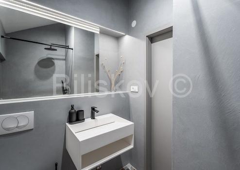 Badezimmer: Toilette, Waschbecken, Dusche, Belüftung, direkte und indirekte Beleuchtung