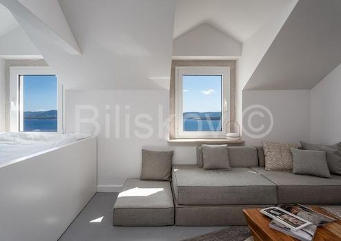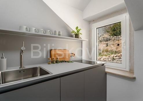 1/9 des Gemeinschaftsgartens inklusive: voll ausgestattete Aussenküche, Whirlpool, finnische Sauna mit Aussicht, Pergola, Essbereich, Sitzecke und Yoga. Die Wohnung wurde zusammen mit dem gesamten Haus im Jahr 2023 komplett renoviert und ist eine erfolgreiche und etablierte Touristenvermietung. Alle Wohneinheiten sind modern eingerichtet, in die einheimische Architektur integriert und können das ganze Jahr über genutzt werden. Der Innenraum zeichnet sich durch elegantes Design und erstklassige Verarbeitung aus.Von jeder Etage aus hat man einen wunderschönen Panoramablick auf die Insel Hvar.Die Gestaltung des Geländes stellt sicher, dass diese Aussicht auch in Zukunft ungehindert bleibt.250 Meter vom Haus entfernt befindet sich ein lokaler Strand, einer der schönsten an der Adria.Öffentlicher Parkplatz ca. 30 Meter vom Haus entfernt.Energieausweis C.Eigentum in Ordnung.