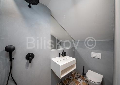 Badezimmer: Toilette, Waschbecken, Dusche, Belüftung, direkte und indirekte Beleuchtung