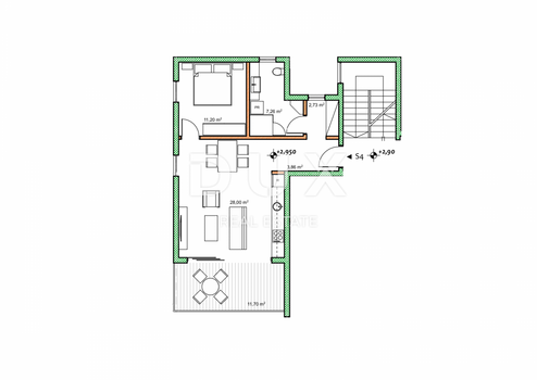 Die Wohnung umfasst 53,10 m2 netto + eine Terrasse von 5,85 m2 netto (11,70 m2 brutto) und bietet einen freien Blick ins Grüne und auf die mittelalterliche Stadt Buje. Mit besonderem Schwerpunkt auf Komfort und Funktionalität wurde der Raum sorgfältig gestaltet, um den höchsten ästhetischen und technischen Standards zu entsprechen.