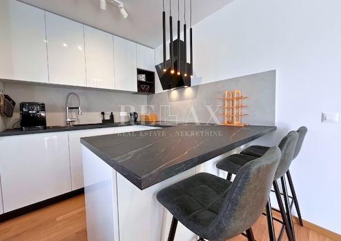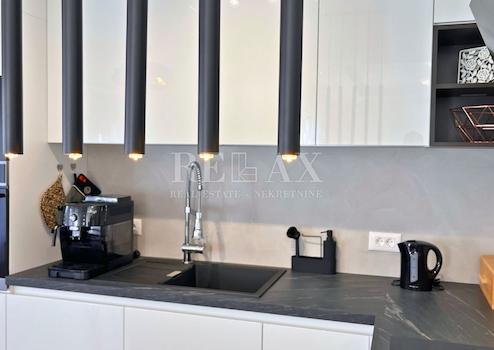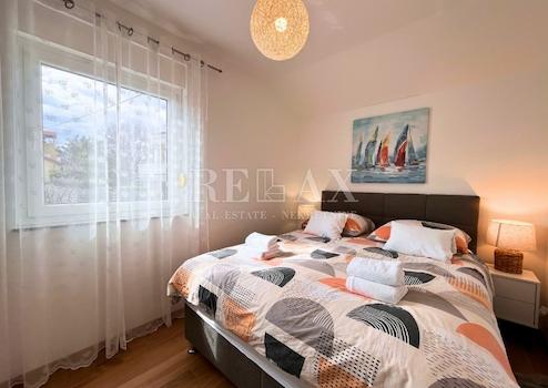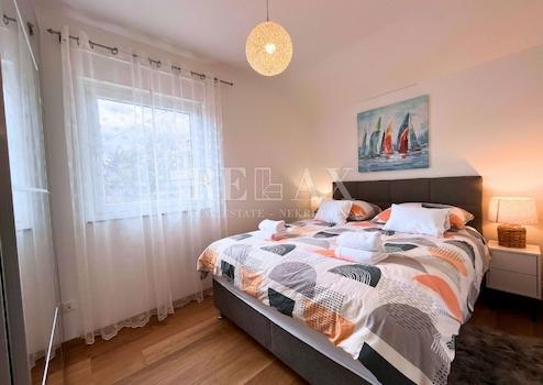 Die Wohnung besteht aus einem Wohnzimmer, einer Küche und einem Essbereich in einem offenen Konzept, das zu einem überdachten Balkon mit Blick auf das Meer und die umliegende Natur führt. Im weiteren Verlauf des Wohnbereichs befinden sich drei Schlafzimmer, zwei Badezimmer, ein Abstellraum sowie ein zusätzlicher Raum im Keller des Gebäudes – ein gemeinschaftlicher Holzlagerraum.