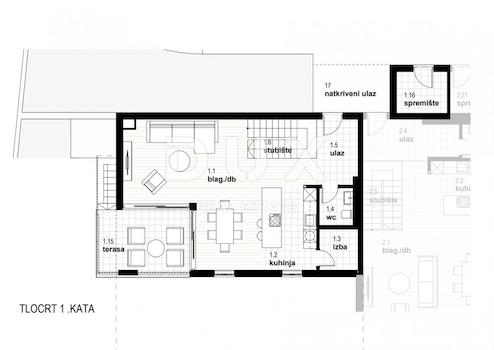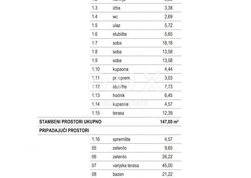 Wir bieten Ihnen eine Immobilie, die Ihnen modernes Design und Eleganz, Komfort und erstklassige Ausstattung bietet und sich in einer schönen, ruhigen Lage in der Nähe von öffentlichen Verkehrsmitteln, Schulen, Kindergärten, Einkaufszentren und zehn Autominuten von Rijeka befindet. Der Komplex aus 4 Wohnhäusern mit insgesamt 8 Wohnungen liegt nördlich der Adria-Autobahn im Gebiet „Zelena Kostrena“ von wo aus sich ein wunderschöner Ausblick auf die gesamte Kvarner Bucht bietet. In unmittelbarer Nähe gibt es 10 Kilometer gepflegte Wander-, Rad- und Fitnesswege, die durch die höchsten Teile von Kostrena vom Gipfel Solin bis zum Gipfel Sopalj führen. Die Zufahrt zu den Häusern erfolgt über die obere Straße, wobei eine Verbesserung und Erweiterung der bestehenden Straße geplant ist. Zu jedem Haus gehören vier Außenstellplätze, das heißt zwei Stellplätze pro Wohneinheit. Jedes Haus besteht aus zwei Wohnungen. Dabei liegen die Wohnungen der oberen beiden Grundstücke übereinander, während die Wohnungen der unteren beiden Grundstücke nebeneinander liegen. Zu jeder Wohnung gehört ein Gartenanteil. HAUS C Wohnung S1 - C: WOHNFLÄCHEN: - Wohnzimmer / Esszimmer 36,02 - Küche 9,59 - Vorratsraum 3,38 - WC 2,69 - Eingang 5,72 - Treppenhaus 5,65 - Zimmer 18,18 - Zimmer 13,58 - Zimmer 13,58 - Badezimmer 4,44 - Waschküche / Abstellraum 3,03 - Treppenhaus 7,73 - Flur 6,45 - Badezimmer 4,57 - Terrasse 12,39 GESAMTWOHNFLÄCHEN: 147,00 m² ASSOZIIERTE FLÄCHEN - Abstellraum 4,57 - Grünfläche 9,65 - Grünfläche 26,22 - Außenterrasse 45,00 - Schwimmbad 21,22 - Grünfläche 18,24 - Stellplatz 1 13,50 - Stellplatz 2 13,35 ANGESCHLOSSENE RÄUME GESAMT: 151,75 m² WOHNUNG S1-C GESAMT: 298,75 m² Diese luxuriöse Wohnung ist auf maximalen Komfort ausgelegt. AUSSTATTUNG: Das Haus, in dem sich die Wohnung befindet, ist gut gebaut und luxuriös ausgestattet, alle eingebauten Materialien, Boden- und Wandbeläge entsprechen den höchsten Standards. - 10 cm dicke Fassadendämmung - Fußbodenheizung - Wärmepumpen - hochwertige Aluminium-Tischlerei. Zur Wohnung gehört ein eigener Garten und 2 PKW-Stellplätze. PREIS: Der angegebene Preis bezieht sich auf eine komplett fertiggestellte schlüsselfertige Anlage, ohne Möblierung. Der Preis beinhaltet die gesetzliche Mehrwertsteuer, der Käufer ist von der Zahlung der Grundsteuer befreit. Bei einem Kauf von einem in Kroatien registrierten Unternehmen ist nach dem Verkauf eine volle Mehrwertsteuerrückerstattung möglich. Sauberes und ordentliches Anwesen. Sicherlich eine wunderschöne Immobilie für luxuriöses Familienleben, aber auch als Investition in Form von Elitetourismus geeignet. EINZIGARTIGES ANWESEN, DAS IHRE AUFMERKSAMKEIT UNBEDINGT WERT IST UND IN EINER TOLLEN LAGE LIEGT!!! KOSTRENA Kostrena ist eine alte, beliebte Küstenstadt, die erstmals zu Beginn des 15. Jahrhunderts erwähnt wurde. Im Jahr 1874 erlangte die Stadt erstmals ihre kommunale Unabhängigkeit, die sie jedoch nur für sehr kurze Zeit, nämlich nur zwei Jahre, behielt. Es ist in zwei Teile gegliedert, St. Lucia und St. Barbara, nach den Namen zweier Kirchen, die es in dieser Gegend gibt. Kostrena liegt in unmittelbarer Nähe der Stadt Rijeka, eingerahmt von der Bucht Martinšćica und der Bucht von Bakar. Die Halbinsel Kostrena ist etwa 10 Kilometer lang und fällt sanft zur Küste hin ab. Auf seiner gesamten Länge gibt es wunderschöne Strände, die im Sommer von Tausenden von Badegästen besucht werden. Die bekanntesten und am meisten besuchten sind jene in der Bucht von Žurkovo, gefolgt von Smokvinovo, Svežanj, Spužvina, Podražica, Nova voda und Perilo. Kostrena besteht aus etwa zwanzig Siedlungen, von denen viele nach Familien benannt wurden. Die bevölkerungsreichsten Orte sind heute Vrh Martinšćice, Glavani und Sv. Lucija, Rožmanići, Doričići und Paveki. Ein charakteristisches Karstgebiet mit mediterraner Vegetation und der berühmten Kostrena-Grotte sowie ein mildes Klima, das manchmal starken Bora-Böen weicht, sind die Merkmale dieser Region.