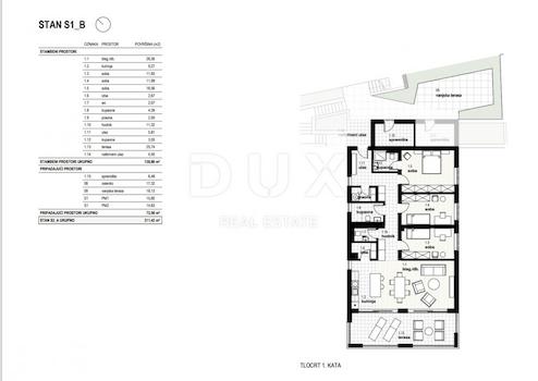 Wir bieten Ihnen eine Immobilie, die Ihnen modernes Design und Eleganz, Komfort und erstklassige Ausstattung bietet und sich in einer schönen, ruhigen Lage in der Nähe von öffentlichen Verkehrsmitteln, Schulen, Kindergärten, Einkaufszentren und zehn Autominuten von Rijeka befindet. Der Komplex aus 4 Wohnhäusern mit insgesamt 8 Wohnungen liegt nördlich der Adria-Autobahn im Gebiet „Zelena Kostrena“ von wo aus sich ein wunderschöner Ausblick auf die gesamte Kvarner Bucht bietet. In unmittelbarer Nähe gibt es 10 Kilometer gepflegte Wander-, Rad- und Fitnesswege, die durch die höchsten Teile von Kostrena vom Gipfel Solin bis zum Gipfel Sopalj führen. Die Zufahrt zu den Häusern erfolgt über die obere Straße, wobei eine Verbesserung und Erweiterung der bestehenden Straße geplant ist. Zu jedem Haus gehören vier Außenstellplätze, das heißt zwei Stellplätze pro Wohneinheit. Jedes Haus besteht aus zwei Wohnungen. Dabei liegen die Wohnungen der oberen beiden Grundstücke übereinander, während die Wohnungen der unteren beiden Grundstücke nebeneinander liegen. Zu jeder Wohnung gehört ein Gartenanteil. HAUS B Wohnung S1 - B: WOHNFLÄCHEN: - Wohnzimmer / Esszimmer 26,56 - Küche 9,27 - Schlafzimmer 11,93 - Schlafzimmer 11,99 - Schlafzimmer 16,56 - Schrank 2,67 - Toilette 2,07 - Badezimmer 4,39 - Waschküche 2,50 - Flur 11,32 - Eingang 5,81 - Badezimmer 3,55 - Terrasse 25,74 - überdachter Eingang 4,50 WOHNFLÄCHEN GESAMT: 138,86 m² SOZIALE FLÄCHEN: - Abstellraum 6,48 - Begrünung 17,32 - Außenterrasse 18,13 - Stellplatz 1 15,80 - Stellplatz 2 14,83 SOZIALE FLÄCHEN GESAMT: 72,56 m² WOHNUNG S1-B GESAMT: 211,42 m² Dieses luxuriöse Apartment ist auf maximalen Komfort ausgelegt. AUSSTATTUNG: Das Haus, in dem sich die Wohnung befindet, ist gut gebaut und luxuriös ausgestattet, alle eingebauten Materialien, Boden- und Wandbeläge entsprechen den höchsten Standards. - 10 cm starke Fassadendämmung - Fußbodenheizung - Wärmepumpen - hochwertige Aluminium-Tischlerei. Zur Wohnung gehört ein eigener Garten und 2 PKW-Stellplätze. PREIS: Der angegebene Preis bezieht sich auf eine komplett fertiggestellte schlüsselfertige Anlage, ohne Möblierung. Der Preis beinhaltet die gesetzliche Mehrwertsteuer, der Käufer ist von der Zahlung der Grundsteuer befreit. Bei einem Kauf von einem in Kroatien registrierten Unternehmen ist nach dem Verkauf eine volle Mehrwertsteuerrückerstattung möglich. Sauberes und ordentliches Anwesen. Sicherlich eine wunderschöne Immobilie für luxuriöses Familienleben, aber auch als Investition in Form von Elitetourismus geeignet. EINZIGARTIGES ANWESEN, DAS IHRE AUFMERKSAMKEIT UNBEDINGT WERT IST UND IN EINER TOLLEN LAGE LIEGT!!! KOSTRENA Kostrena ist eine alte, beliebte Küstenstadt, die erstmals zu Beginn des 15. Jahrhunderts erwähnt wurde. Im Jahr 1874 erlangte die Stadt erstmals ihre kommunale Unabhängigkeit, die sie jedoch nur für sehr kurze Zeit, nämlich nur zwei Jahre, behielt. Es ist in zwei Teile gegliedert, St. Lucia und St. Barbara, nach den Namen zweier Kirchen, die es in dieser Gegend gibt. Kostrena liegt in unmittelbarer Nähe der Stadt Rijeka, eingerahmt von der Bucht Martinšćica und der Bucht von Bakar. Die Halbinsel Kostrena ist etwa 10 Kilometer lang und fällt sanft zur Küste hin ab. Auf seiner gesamten Länge gibt es wunderschöne Strände, die im Sommer von Tausenden von Badegästen besucht werden. Die bekanntesten und am meisten besuchten sind jene in der Bucht von Žurkovo, gefolgt von Smokvinovo, Svežanj, Spužvina, Podražica, Nova voda und Perilo. Kostrena besteht aus etwa zwanzig Siedlungen, von denen viele nach Familien benannt wurden. Die bevölkerungsreichsten Orte sind heute Vrh Martinšćice, Glavani und Sv. Lucija, Rožmanići, Doričići und Paveki. Ein charakteristisches Karstgebiet mit mediterraner Vegetation und der berühmten Kostrena-Grotte sowie ein mildes Klima, das manchmal starken Bora-Böen weicht, sind die Merkmale dieser Region.