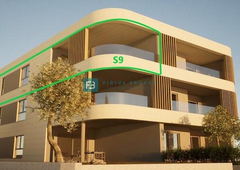 Die Wohnung S9 mit einer Gesamtnutzfläche von 107,49 m² (Wohnfläche 79,59 m² + Terrasse 27,90 m²) + Stellplatz 12,50 m² befindet sich im 2. Obergeschoss. Sie ist nach Südwesten ausgerichtet und besteht aus einem Eingangsbereich, einem Flur, drei Schlafzimmern, zwei Bädern, einer Küche mit Esszimmer und einem Wohnzimmer mit Zugang zu einer großen überdachten Terrasse von 27,90 m² mit herrlichem Meerblick. Zur Wohnung gehört ein Stellplatz im Innenhof des Gebäudes. Der Kaufpreis beträgt 460.000 € (inkl. MwSt. – der Käufer ist von der Zahlung der 3%igen Grundsteuer befreit).
