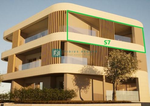Die Wohnung S7 mit einer Gesamtnutzfläche von 97,52 m² (Wohnfläche 79 m² + Terrasse 18,52 m²) + Stellplatz 12,50 m² befindet sich im 2. Obergeschoss. Sie ist nach Südosten ausgerichtet und besteht aus einem Flur, zwei Schlafzimmern, einem Hauswirtschaftsraum, zwei Bädern, einer Küche mit Esszimmer und einem Wohnzimmer mit Zugang zu einer überdachten Terrasse von 18,52 m² mit herrlichem Meerblick. Zur Wohnung gehört ein Stellplatz im Innenhof des Gebäudes.