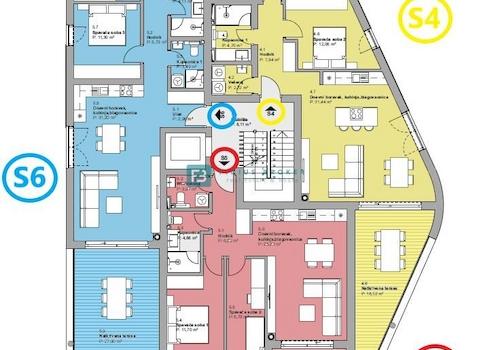 Die Wohnung S6 mit einer Gesamtnutzfläche von 107,49 m2 (Wohnfläche 79,59 m2 + Terrasse 27,90 m2) + Stellplatz 12,50 m2 befindet sich im 1. Obergeschoss. Es ist nach Südwesten ausgerichtet. Es besteht aus einem Eingang, Flur, drei Schlafzimmern, zwei Bädern, Küche mit Esszimmer und Wohnzimmer mit Zugang zu einer großen überdachten Terrasse von 27,90 m2. Zur Wohnung gehört ein PKW-Stellplatz im Hof des Gebäudes. Der Preis beträgt 420.000 € (inkl. MwSt. – der Käufer ist von der Zahlung der 3 % Grundsteuer befreit).