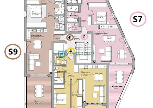 Die Wohnung S9 mit einer Gesamtnutzfläche von 107,49 m2 (Wohnfläche 79,59 m2 + Terrasse 27,90 m2) + Stellplatz 12,50 m2 befindet sich im 2. Obergeschoss. Es ist nach Südwesten ausgerichtet. Es besteht aus einem Eingang, Flur, drei Schlafzimmern, zwei Bädern, Küche mit Esszimmer und Wohnzimmer mit Zugang zu einer großen überdachten Terrasse von 27,90 m2. Zur Wohnung gehört ein PKW-Stellplatz im Hof des Gebäudes. Der Preis beträgt 460.000 € (inkl. MwSt. – der Käufer ist von der Zahlung der 3 % Grundsteuer befreit).