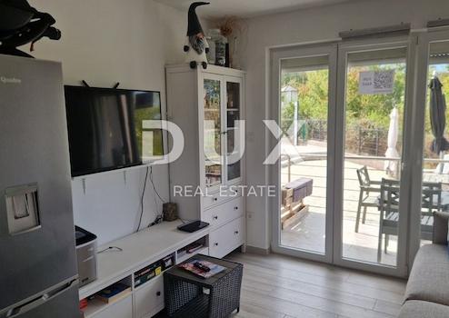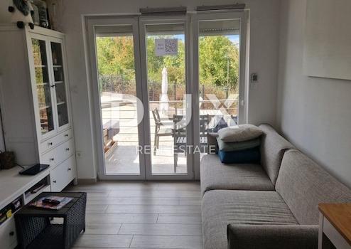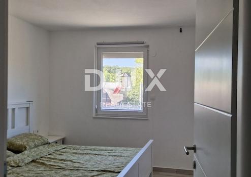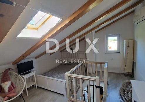 Die Maisonette-Wohnung mit einer Gesamtnettowohnfläche von 71 m2 befindet sich in einem 2020 errichteten freistehenden einstöckigen Gebäude mit nur drei Wohneinheiten. Es besteht aus einem Erdgeschoss und einem hohen Dachgeschoss, die durch eine Innentreppe verbunden sind. Im Erdgeschoss befinden sich ein Schlafzimmer, ein Badezimmer und eine Küche mit einem Wohnzimmer, das auf eine halb überdachte Terrasse führt. Im Hochdachgeschoss befinden sich ein Schlafzimmer und ein kleiner Abstellraum. Im Juni 2023 wurde die neue Küche nach Maß eingebaut und im Mai 2024 das Bad renoviert. Im Erdgeschoss und im Dachgeschoss befinden sich zwei Klimaanlagen, zur Beheizung sind im Bad und im Zimmer im Erdgeschoss zwei Decken-Infrarotstrahler installiert. Die Wohnung verfügt über einen Kamin, sodass auch eine Beheizung mit Holz/Pellets möglich ist. Die Tischlerei besteht aus PVC mit Moskitonetzen und ALU-Rollläden. Auf dem 500 m2 großen Grundstück stehen drei Stellplätze zur Verfügung, einer für jede im Eigentumswohnungsgutachten eingetragene Wohneinheit (12,5 m2). Der restliche Garten wird von allen Miteigentümern gemeinsam genutzt und besteht aus einem Swimmingpool (21 m2), einer Sommerküche (19 m2) und einer Liegewiese. Die Kosten für Strom und Poolpflege sowie Strom für die Sommerküche teilen sich in drei Teile auf und betragen 300 – 400 € pro Jahr (pro Wohnung). Jede Wohneinheit verfügt über einen eigenen Strom- und Wasserzähler, die Sommerküche, an die auch der Pool-Maschinenraum angeschlossen ist, ist mit einem Kontrollzähler ausgestattet. Aufgrund seiner Lage in der Nähe des Zentrums der Stadt Krk und seiner Annehmlichkeiten eignet sich das Anwesen für das Familienleben, aber auch für die touristische Vermietung.