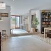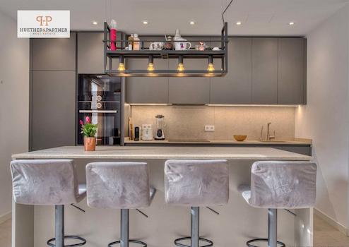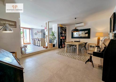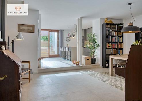 Beim Betreten des Hauses durch die historische Eingangstür eröffnet sich ein harmonisch gestalteter Wohnraum mit freiem Blick bis in den Garten. Der offene Grundriss führt Sie fließend vom Wohnbereich über den Essplatz in die moderne Designerküche mit direktem Zugang zur Terrasse – ein idealer Ort für gesellige Abende im Freien.