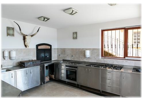 A professzionális konyhában Siemens márkájú konyhatechnikai eszközök, többfajta tűzhely, halsütők, hatalmas fatüzelésű kemence, kacsasütők, grillezők kaptak helyet. Így akár nagyobb társaság kiszolgálására is alkalmas. A konyha- és tálalóhelyiségek előteréből közvetlenül a hatalmas fedett teraszra jutunk, ahonnan a panoráma fantasztikus és 180 fokban láttatja a Dunát.