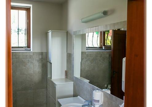 A felső szinten elektromos redőnnyel, a terasszal is egybenyitható, éttermi funkciót is ellátó, rozsdamentes anyagból készült és minden igényt kielégítő, konyhatechnológiai eszközökkel felszerelt konyha, külön tálalóhelyiség, szerviz helyiség, valamint nemenként elkülönített szaniter blokkok is rendelkezésre állnak.