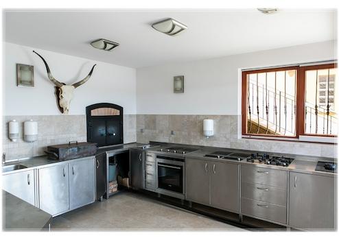 Die professionelle Küche ist mit Küchengeräten der Marke Siemens, mehreren Herdarten, Fischgrills, einem riesigen Holzofen, Entenbrätern und Grills ausgestattet. Somit eignet es sich auch für die Betreuung größerer Unternehmen. Vom Vorraum der Küche und des Esszimmers gelangt man direkt auf die riesige überdachte Terrasse, von der aus man ein fantastisches Panorama mit einem 180-Grad-Blick auf die Donau hat.