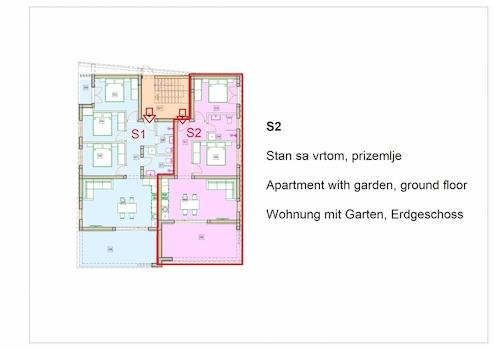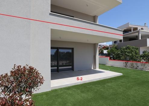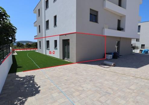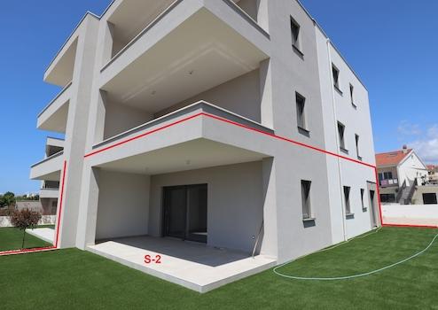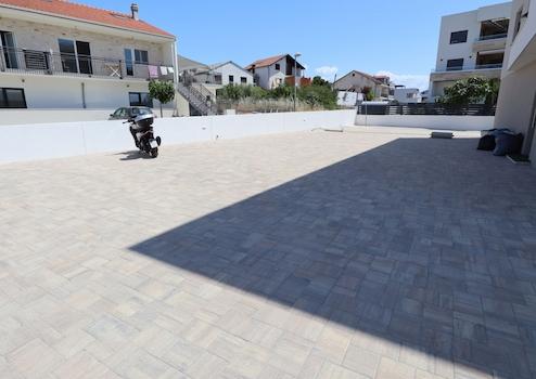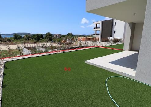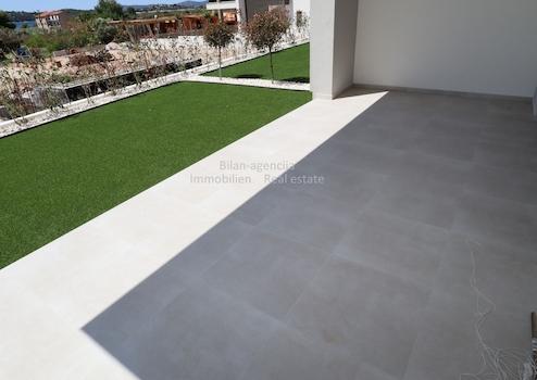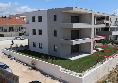 Zu verkaufen: Wohnung 82,55 m2, im Erdgeschoss eines Neubaus in Vodice. Mit angelegtem Garten, nur 350 m zum Strand.