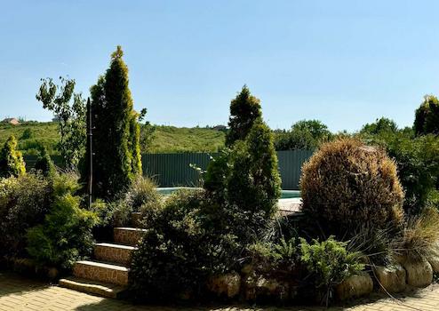 -dísznövényekkel beültetett, szépen parkosított árnyas udvar, a nyári melegben kellemes hűs árnyékot és szél védettséget adó több évtizedes fenyőfa, valamint örökzöldek, cserjék teszik hangulatosabbá a környezetet