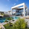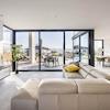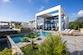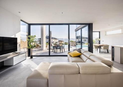 Helles Esszimmer und Wohnzimmer mit Blick auf das Meer und den Pool