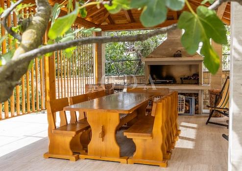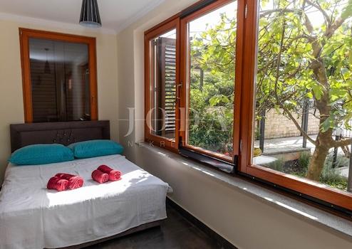 Der gesamte Garten ist mit istrischen Steinen dekoriert und gepflastert, während die Grünflächen mit Obstbäumen und mediterranen Pflanzen angereichert sind.