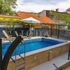 Im zentralen Teil des Gartens befindet sich ein beheizter Swimmingpool, während im vorderen Teil eine große Gartenlaube mit Grill und einem Platz für gesellige Runden steht.