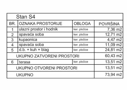 Zu verkaufen: Wohnung S4 im ersten Stock mit einer Gesamtfläche von 73,94 m² (Innenfläche 60,43 m² + Terrasse 13,51 m²)