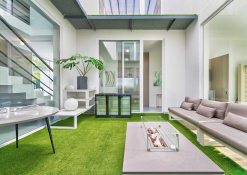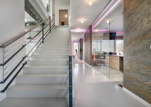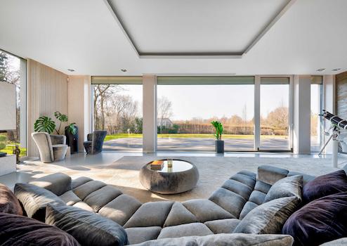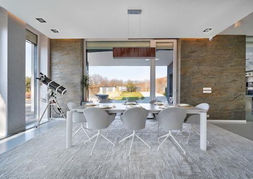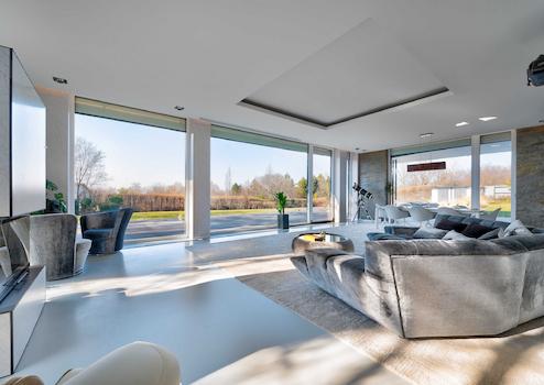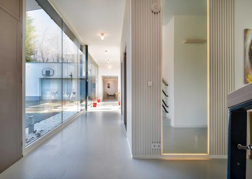 Durch die Lage der Räume, das riesige ATRIUM in der Mitte des Gebäudes, die großen „FULL WALL SIZE“-FENSTER – die bei Bedarf mit Außenjalousien beschattet werden können – strahlen sie ein besonderes Lebensgefühl auf die Menschen aus, die das Anwesen betreten.