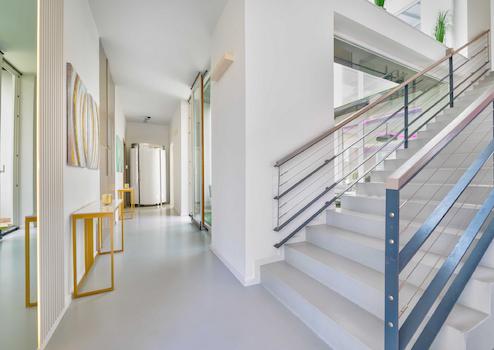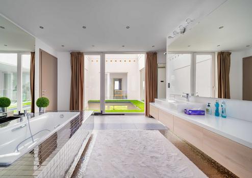 Auf zwei Etagen dienen Wohnzimmer-Küche-Esszimmer + 5 Schlafzimmer, 3 Badezimmer, Garderoben, Fitnessraum, Sauna, Dampfkabine, Atrium, Solarium dem Komfort der Bewohner.