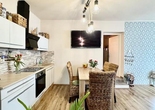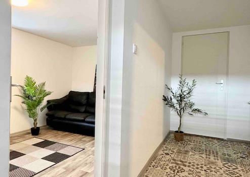 — NEUE Qualitätsböden, Laminatboden in Zimmern, Bad und Küche mit Keramikfliesen gefliest, farblich abgestimmt