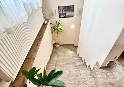 -bejárattól jobbra egy kényelmes 6 m²-es előtér cipők - kabátok elhelyezésére és feljárat az EMELETRE, a szintek közötti közlekedést kényelmes kiosztású lépcsőkön LÉPCSŐHÁZ biztosítja