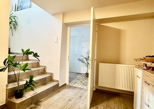 -rechts vom Eingang befindet sich ein komfortables 6 m² großes Foyer zur Aufbewahrung von Schuhen und Mänteln und Zugang zum OBERGESCHOSS, das TREPPENHAUS bietet über bequem angeordnete Treppen Zugang zwischen den Etagen