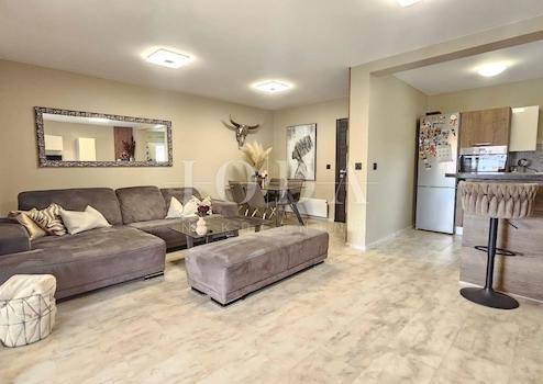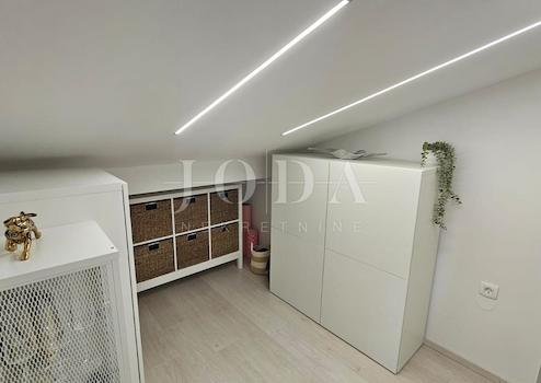 Die Wohnung selbst erstreckt sich über zwei Etagen. In der unteren Etage befinden sich zwei Schlafzimmer, ein Badezimmer und ein sehr großer Raum mit einem offenen Konzept von Wohnzimmer und Küche mit Zugang zu einem großen Balkon. Der unten beschriebene Teil erstreckt sich über 80 m2, während sich im Dachgeschoss ein schönes Schlafzimmer und ein großer Abstellraum befinden, die zusammen eine Fläche von fast 30 m2 ausmachen.