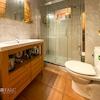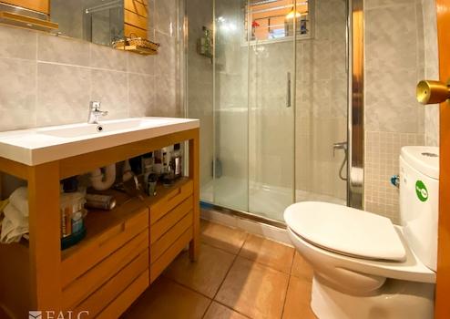 Das Badezimmer ist mit einer Dusche, Waschbecken sowie einer Toilette ausgestattet. Die Fliesen und praktische Ablagemöglichkeiten sorgen für Komfort.