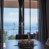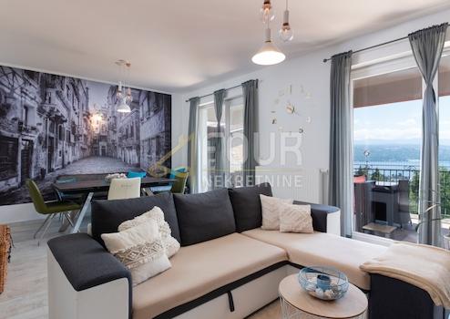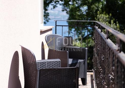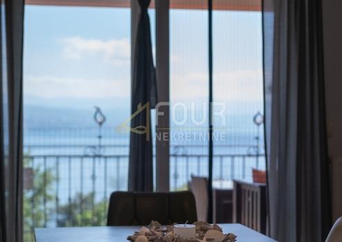 Vom Wohnbereich aus gelangt man auf eine überdachte Terrasse mit 27 m² und freiem Blick auf das Meer und Opatija – ideal zum Entspannen im Freien das ganze Jahr über.