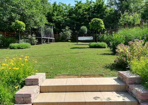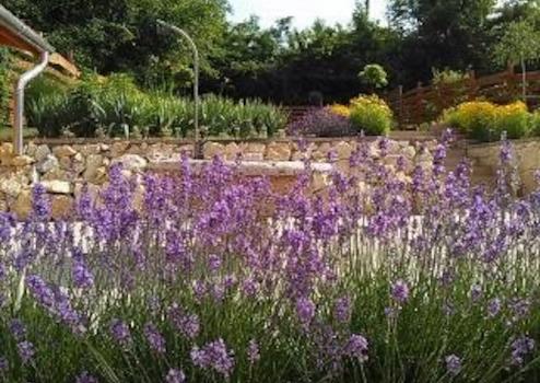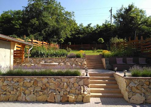 -a belső zárt udvar egy része térkövezett a másik része igényesen parkosított, virágzó növényekkel, díszfákkal, cserjékkel, napozó pad mögött levendula parkkal