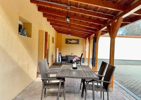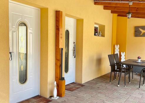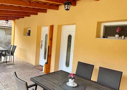 -mindkét apartman közvetlen 32 m²-es fedett terasz és udvar kapcsolatos