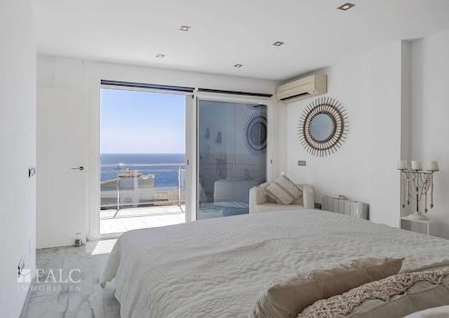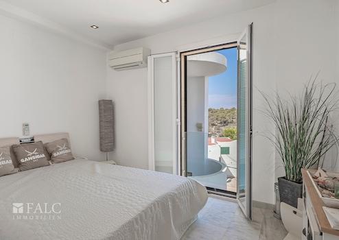 Zwei stilvolle Schlafzimmer, jeweils mit eigenem Badezimmer, bieten Ihnen und Ihren Gästen höchsten Komfort und Privatsphäre. Besonders hervorzuheben ist der Hauptschlafraum, der über einen eigenen Zugang zur Meerblick-Terrasse verfügt. Ein großzügiger Ankleidebereich im Verbindungskorridor ergänzt das Raumangebot ideal.
