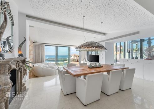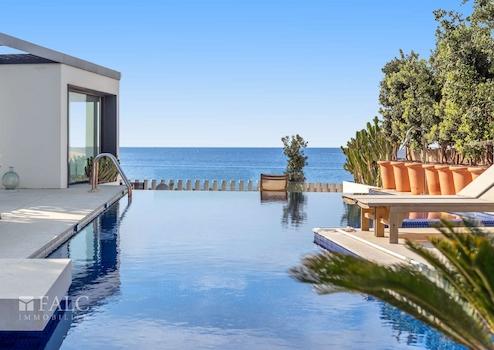 Ein besonderes Highlight des Anwesens ist der Infinity- und beheizbare Pool, der mit seiner Lage und der dazugehörigen Terrasse einen Panoramablick aufs Meer bietet und unvergessliche Sonnenuntergänge erlebbar macht. Der Außenbereich ist meisterhaft angelegt und umfasst zudem ein separates Gästehaus, ideal für Besucher oder Personal.