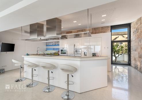 Eine offene und großzügige Wohnküche im Haupthaus, ausgestattet mit State-of-the-Art-Einbaugeräten, lädt zu geselligen Abenden mit Freunden und Familie ein. Die Verbindung von polierten Marmorböden und naturbelassenen Steinmauern verleiht dem Raum eine warme und zugleich moderne Atmosphäre. Die clevere Raumaufteilung ermöglicht fließende Übergänge zwischen Wohn-, Ess- und Kochbereich.