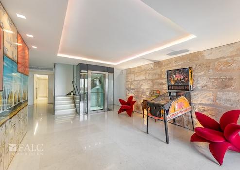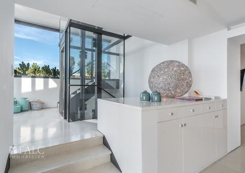 Der hauseigene Personenfahrstuhl und ein separater Lastenaufzug erstrecken sich bis zur Terrasse, was einen mühelosen Zugang zu allen Etagen ermöglicht, zudem verfügt das Anwesen über ausreichend Platz für vier Fahrzeuge in den Garagen und bietet damit vollständigen Komfort im Alltag.