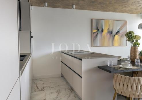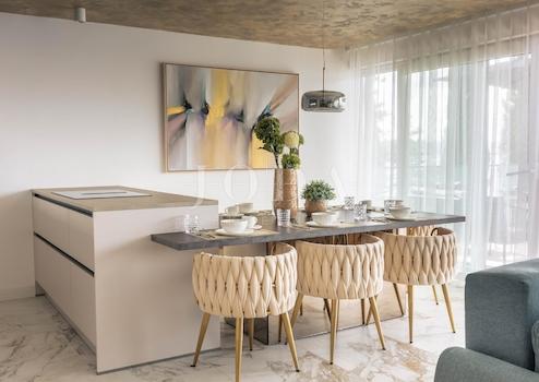 Modernes großes Wohnzimmer mit Küche und Bar. Konzipiert als Wohnzimmer mit einem Billardtisch, der in einen Esstisch verwandelt werden kann. Eine große Terrasse mit schöner Aussicht und einem Kamin. Badezimmer mit WC. Flur, der zu 2 Schlafzimmern führt, wovon eines ein eigenes, verstecktes Bad mit Badewanne hat. Fläche ca. 130 m2