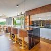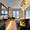 Bei den hochwertigen Kaltfliesen handelt es sich um Marazzi-Fliesen im Format 60 x 120 und die Treppe ist mit zwei extragroßen Feinsteinzeugfliesen in Sahara Noir ausgestattet, die sich in der Küche und an der Fernsehwand widerspiegeln. Bei den warmen Belägen handelt es sich um deutsches Premium-Vollholzparkett mit kratz- und wasserfester Beschichtung. In der Küche wurden Miele-Geräte verbaut, wobei eine Dunstabzugshaube in das Kochfeld integriert ist.