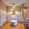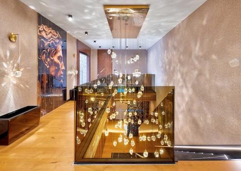Die Villa ist durchgehend mit hochwertiger Zebrano-Holzvertäfelung und raumhohen Innentüren ausgestattet. Die ca. 6 Meter Innenhöhe des Treppenhauses verleihen der Immobilie ein besonderes Erscheinungsbild. Die Kristallleuchter werden individuell an die Inneneinrichtung angepasst und eines der Highlights des Hauses ist die maßgefertigte Kristall-Hängeleuchte.
