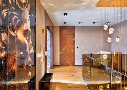 A villaházban mindenütt prémium Zebrano faburkolatok és mennyezetig érő síkban záródó beltéri ajtók találhatók. A lépcsőház mintegy 6 méteres belmagassága különleges megjelenést ad az ingatlannak. A kristály csillárok az enteriőrnek megfelelően egyedi gyártásúak, a ház egyik ékessége az itt található, ide készített kristály függeszték.