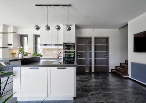 Der prägende, zentrale Teil des Erdgeschosses ist der offene, S-orientierte, große Glasflächen umfassende WOHN-ESS-KÜCHE-Raum mit überdachten Terrassen aus mehreren Richtungen.