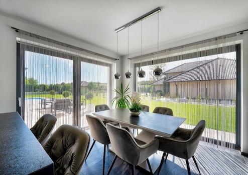 Az épület körül 40 m2 fedett terasz található, és egy 10 x 4 m-es, fűthető úszómedence szolgálja a lakók kényelmét.