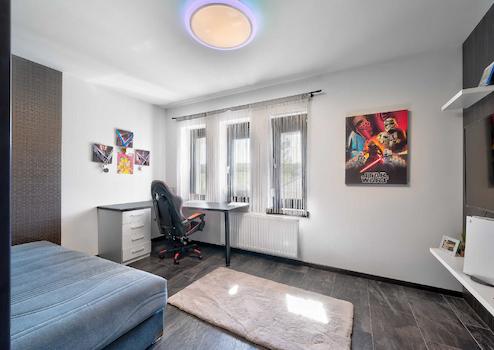 A tetőtér beépített része teljesértékű helyiségekkel rendelkezik, ahol a gyerekek birodalma található, 2 kényelmes méretű hálószobával - saját gardróbbal, egy fürdőszobával, valamint egy dolgozószobával.