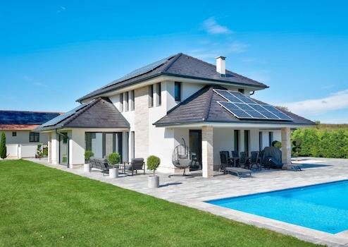 Rund um das Gebäude erstreckt sich eine 40 m2 große, überdachte Terrasse und für den Komfort der Bewohner sorgt ein 10 x 4 m großer, beheizter Swimmingpool.