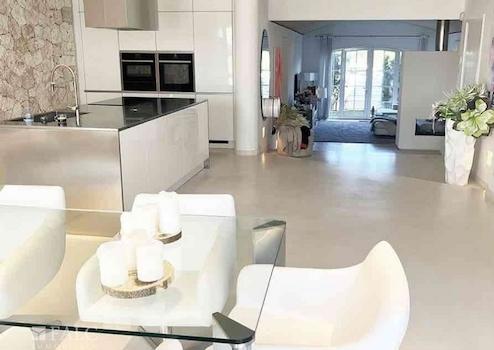 Im Inneren des Apartments erwartet Sie ein offenes Raumkonzept mit ca. vier Meter hohen Decken und einer Kombination aus hochwertigem Natursteinboden und edlem Parkett, die dem gesamten Wohnbereich eine exklusive, warme Atmosphäre verleihen. Der Wohnraum gliedert sich in drei fließend miteinander verbundene Bereiche: ein einladendes Wohnzimmer mit großzügiger Sofalandschaft, ein stilvoller Essbereich mit hochwertigem Glastisch und sechs eleganten Ledersesseln sowie eine offene Einbauküche der renommierten Marke Nolte. Die Küche ist mit einer zentralen Kochinsel ausgestattet und lässt selbst bei passionierten Hobbyköchen keine Wünsche offen.